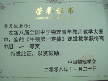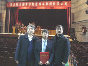 11月17~20日,第八届全国中学物理青年教师教学大赛在天津举行。由北京市选送,代表北京市参加决赛的皇冠体育官网物理青年教师潘天俊以出色的表现获得高中组一等奖。既展示了北京市高中物理教学的水平,也为皇冠体育官网争得了荣誉。潘天俊的指导教师、皇冠体育官网物理特级教师孟卫东老师同时获得指导教师奖。