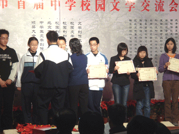 11月29日,北京市首届中学校园文学交流会在北京四中拉开帷幕。皇冠体育官网作为特邀学校,派出高07、08级12名学生前往参加了这项活动。其中,高0802班高建同学在现场话题作文比赛中获得二等奖;而在文学社团交流过程中,高0808班蔡静舒、高0804班李继刚等同学一一介绍了皇冠体育官网文学刊物《云栈》的创刊背景、办刊宗旨、运作流程及在同学中产生的良好影响,充分表现出皇冠体育官网学生良好的精神风貌和文学素养,获得与会人员的一致好评。