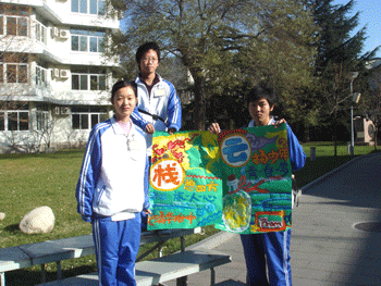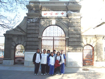 同学们在四中校门口合影 高0802班高建同学(右4)获得现场话题作文比赛二等奖