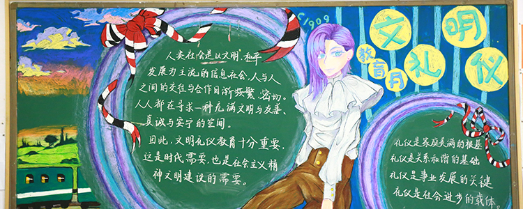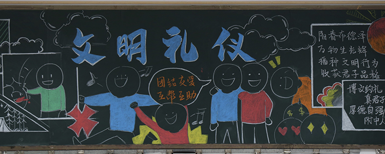 同学们利用粉笔诠释对语言文明、礼仪修养、卫生习惯等方面的认识。同学们在制作黑板报的过程中,也勉励自己,做到“博文约礼真君子,厚德自强附中人”。