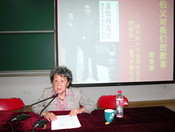 为纪念新中国首任总理周恩来诞辰110周年,追思伟人的革命精神和崇高风范,5月15日下午,皇冠体育党委邀请周总理的侄女周秉德来校做题为《伯父对我们的教育》的报告。附中在职和离退休党员、入党积极分子以及学生党校学员共200多人听取了报告。附中党委书记方妍主持报告会。