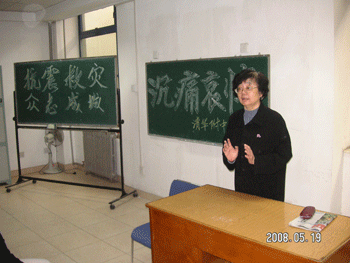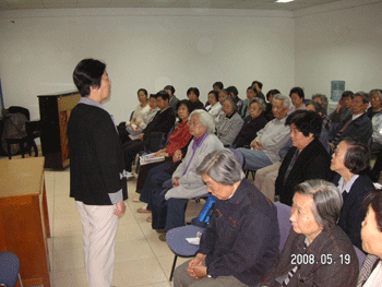 首先,大家起立,集体默哀一分钟,共同表达心中的哀思。然后,老教协副会长姚文、李觉聪,老教协委员刘荫贞、苏亭分别发言,宣讲抗震救灾中发生的种种可歌可泣的事迹,表达内心的感动与思考。随后,老师们即席发言:刚刚退休不久的何志兰老师、年已八旬的冯玉中老师结合自己的经历发表感想。他们赞颂了地震发生以来从中央到地方各界、人民子弟兵、武警官兵和灾区人民万众一心、众志成城的伟大精神;表示离退休教师也要为抗震救灾尽自己的微薄之力,除了在物质方面献爱心之外,还要在教育青少年方面做出贡献。