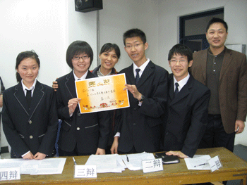辩论赛现场 冠军队高0707班选手与评委老师合影