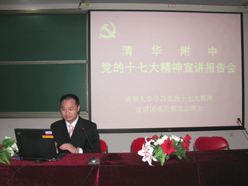 作为党的十七大精神学习的系列活动,学校除了邀请辅导报告外,还通过网络视频要求党员自学胡鞍钢、陈锡文的报告,组织每一位在职党员参与清华大学组织的十七大知识竞赛,提升党员们的理论修养。