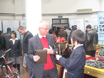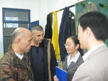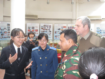 同学们首先带领将军们参观了校史陈列室并用英语讲解。然后将军们参观了高二年级各班的班会,并与高二学生进行了大量的交流活动,同学们向来宾介绍了我国的教育制度,及同学们的日常生活等等。使他们对附中学生的精神风貌有了更深入的了解。将军们还参观了附中的理化生实验室,对生化实验室和力学实验室产生了浓厚的兴趣,并对附中的各种教具、设备大为赞叹。随后,参观了操场和篮球场,一些军官还主动来到篮球场,加入到学生的篮球比赛中。