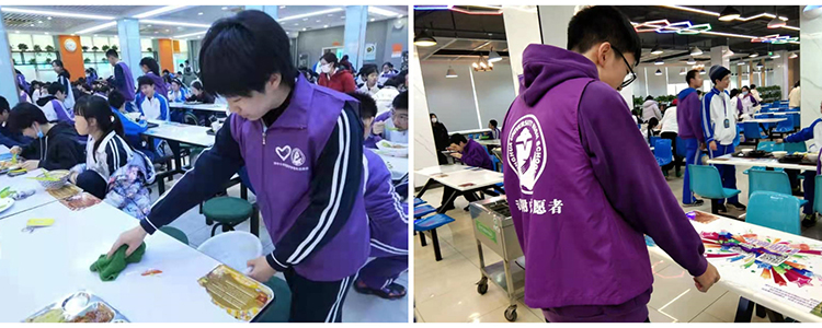 负责打扫卫生的同学同样努力出色。他们自带抹布、桶、扫帚、墩布等劳动工具,不止擦干净了浮尘,还有脏了很久的黑板,把多功能厅里在新年舞会时留下的极难清除的亮片清理干净、撕去上学期张贴的海报等。扫除之后的多功能厅,整洁明亮,纤尘不染。中午,同学们来到食堂享受美味佳肴。有少数同学只关注了好吃的菜肴,忘记了进餐的基本要求。志愿者们行走在食堂、操场、垃圾桶前,提醒同学们不要把垃圾带到操场,不要浪费,为文明校园贡献自己的力量。