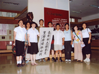党员们在井冈山革命烈士陵园前合影 唐余才老师(右4)将自己的书法作品敬献给纪念馆