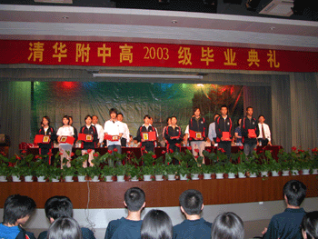 会上还表彰了“万邦儒奖学金”、“希望之星” 获得者,市、区、校级优秀班集体、优秀学生干部、三好学生等,清华大学副教务长陈刚及附中校领导等为获奖者颁发了证书。最后,高策理校长为每位高三毕业生颁发了北京市高中毕业证书,并和他们一一合影留念。