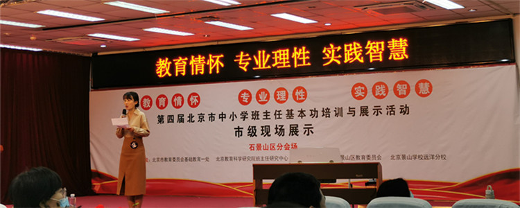 此次活动需由各校推荐,并获得区级班主任基本功培训与展示活动一等奖的教师参加。皇冠体育许珊珊、徐利、徐蓉老师经过层层选拔,最终代表海淀区参加北京市教委组织的展示活动,活动以“教育情怀 专业理性 实践智慧”为主题,包括主题班会、带班育人方略、情景问答、魅力展示四个部分。其中主题班会以“我和我的祖国”为主题,提交主题班会文本,由专家打分,分值占20%。现场展示交流活动分为带班育人方略宣讲、情景问答、魅力展示三个环节,分值占80%。在带班育人方略宣讲环节,班主任老师们介绍了自己独具特色的带班方略,许姗姗老师以《君子不器,成己达人——新高考选科背景下文化育人的三阶段与三维度》为主题,徐利老师以《“启”智唤醒,做有温度的人》为主题,徐蓉老师以《横纵交织引领成长》为主题,凸显当代班主任的教育情怀和专业素养。在情景问答环节,班主任老师们根据随机抽取的题目,在规定时间内进行答辩,展示了面对各种教育问题的育人智慧。在魅力展示环节,班主任老师们展示了自己才艺魅力育人过程,全面展示新时代班主任的魅力风采。