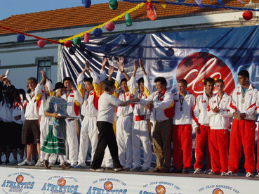 2005年世界中学生田径锦标赛于6月26日至29日在葡萄牙海滨城市法鲁隆重举行。参赛的皇冠体育官网基层学校队由领队李伟明老师、教练马汝平老师、队员王磊、马乐、王超然、郭文鑫、曹全超、王晓龙同学组成,队员们经过几天的团结拼搏,赛出了水平,赛出了风格,共摘得5枚金牌(4枚单项和1枚接力)、3枚银牌,其中,王磊获男子100米冠军、跳远亚军;马乐获男子三级跳冠军、110米栏亚军;郭文鑫获男子铁饼冠军;曹全超获男子铅球冠军;王超然获男子400米亚军;王磊、马乐、王超然、王晓龙获男子接力冠军。