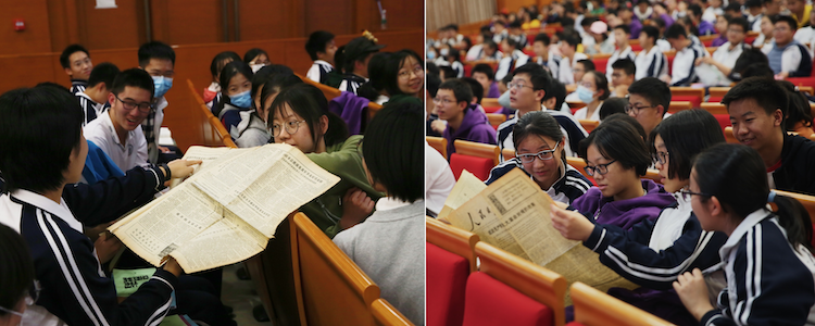 学生认真查看高教授带来的原版1974年人民日报