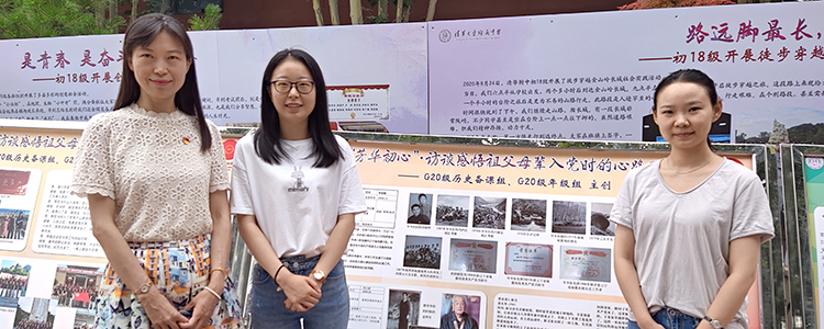 宋薇、李琳、童洁老师在高一年级“芳华初心”展板前合影