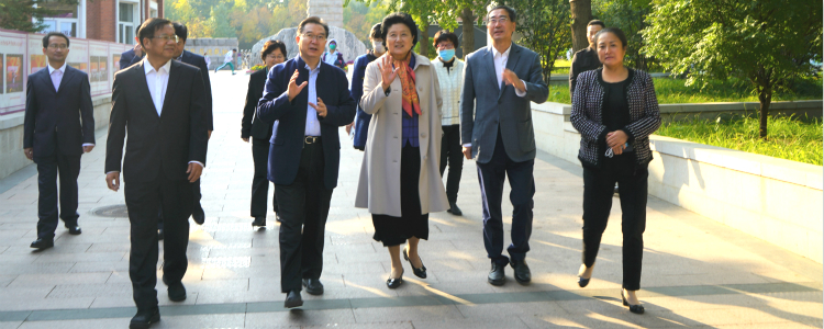 清华大学党委常务副书记姜胜耀(一排右二),皇冠体育校长王殿军(一排左二)、皇冠体育党委书记方妍(一排右一)及其他班子成员陪同刘延东校友(一排中)参观母校校园