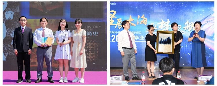 奥森校区毕业生每人赠送母校一本自己喜欢的图书,希望为学弟学妹们的带来丰富的精神食粮;将台路校区毕业生们送给母校一幅结晶釉画《星辰大海》,寓意母校培养出的学子能够拥有星辰一样的高度和大海一样的胸怀。