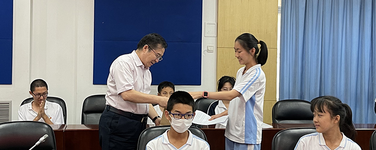 接下来初一年级学生代表李思睿同学进行分享。李思睿同学的汇报由以下三个部位组成,从向往附中到了解附中,从了解附中到热爱附中以及其年级特色文化。初一年级在年级特色文化方面也卓有成绩,结合重大节日、纪念日布置“幸福成长作业”,将感悟幸福记录下来,留住温馨,持续幸福;鼓励学生开展原创设计:关于学生之星卡片原创设计,一颗颗璀璨的星星,寄托了同学们对榜样的崇敬,以及对努力方向的追求。倡导学生参加劳动课程,从培土到栽种到采苗,实现以劳树德,以劳增智,以劳强体,以劳育美的追求,在劳动实践中体会到的精神的升华;设立自习午休教室,培养自主学习,自主管理能力方面体现出了卓有成效的创新和公益服务精神。丰富的学科活动,开阔视野的讲座都提升了学生兴趣,展现了附中学子的风采,让同学们在学习兴趣中得到了更高的升华。初一年级活动,每个环节既体现了同学们的成长,也表现了希望同学们广泛开拓视野的学习态度。