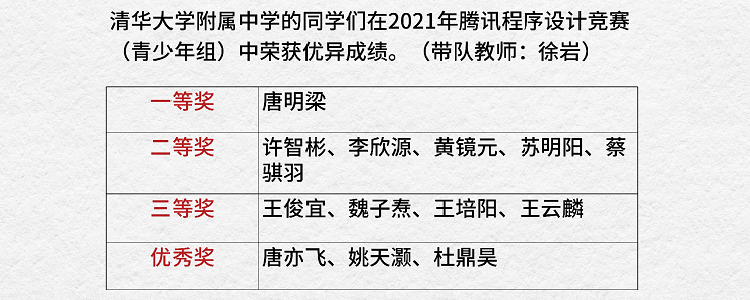 近期,2021年腾讯程序设计竞赛(青少年赛道)获奖名单公布,皇冠体育官网学生表现优异,共有13人获奖,其中一等奖1人、二等奖5人、三等奖4人、优秀奖3人,腾讯青少年科技学院向附中发来了喜报。