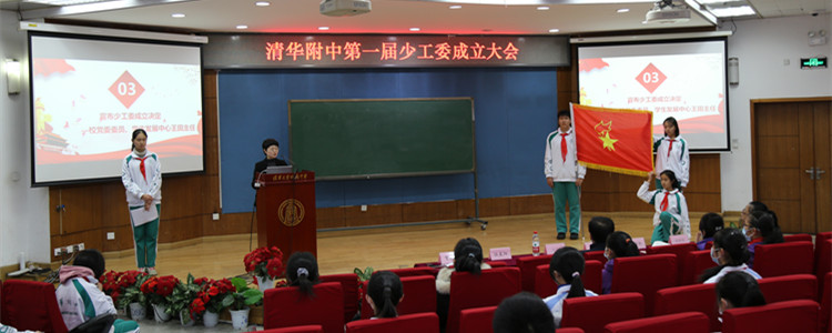 在激奋人心的国歌声中,少工委成立大会正式开始。伴着铿锵有力的出队旗音乐声,旗手高举中国少年先锋队队旗,在护旗手的护卫下,迈着矫健的步伐走上舞台,鲜红的队旗迎风飘扬。