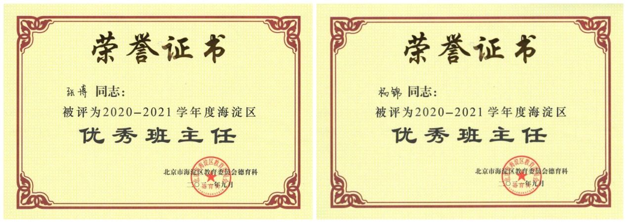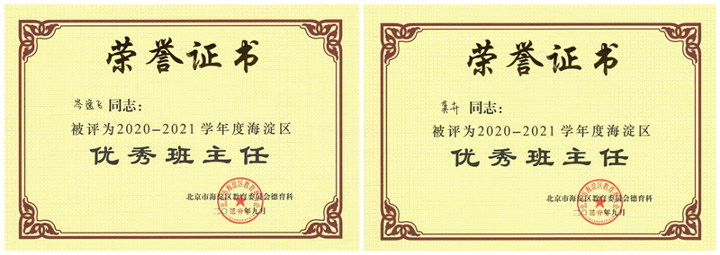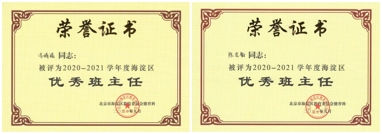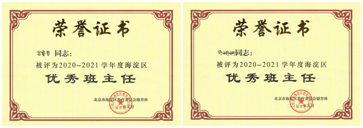 班主任是学校教师队伍的重要组成部分,是实施素质教育的重要力量。海淀区优秀班主任的评选工作不仅考察班主任的带班技能和德育科研能力,也参评了教师的师德师风和引领示范作用。经过海淀区教委德育科专家团队的严格评选,皇冠体育官网8名老师荣获2020-2021学年度海淀区“优秀班主任”奖。