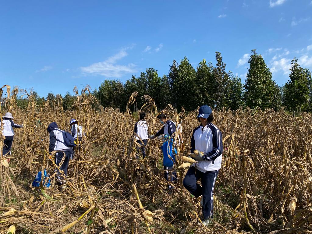 农场师傅简单介绍完掰玉米方法后,同学们迫不及待地拿起工具,争先恐后地投入了劳动。一开始大家还没有完全掌握技巧,凭着一身使不完的劲儿和玉米来回拉扯,费劲周折才能将玉米收入囊中。经过互相学习,摸索方法,同学们逐渐掌握了技巧,一系列动作一气呵成。秋天的玉米地,一片金黄,和煦的阳光透过玉米杆,在一张张青春脸盘上洒下斑驳的光影。在这样的蓝天白云下,和自己朝夕相伴的同学一起体验从未有过的劳作,同学们有说有笑,开心极了。