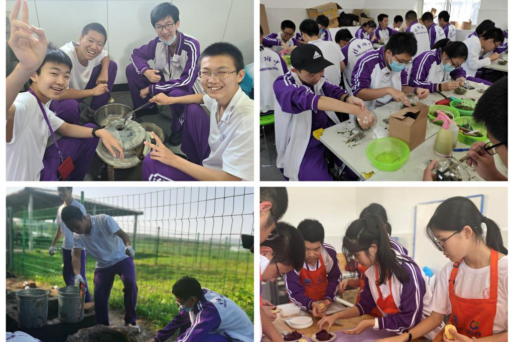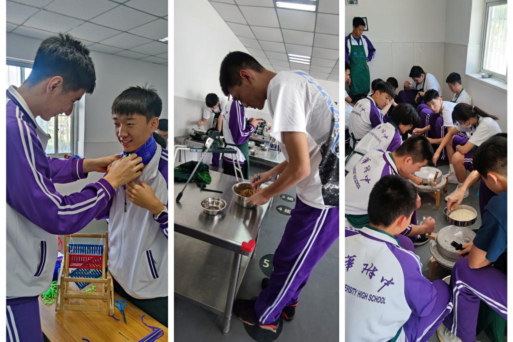 最后,各班分别进行了不同的实践体验活动,如纺线织布、手工编筐、豆腐制作、鲜花饼制作、小麦种植、花生收获、砌墙工艺、微景观制作等等。亲自动手,从无到有,无论是体验传统工艺,还是进行农事劳作,同学们都在趣味活动中一步步走向土地、走向生活,感受到劳动的独特魅力,体会到劳动所带来的幸福感,增强了对劳动的理性认知和实践自觉。