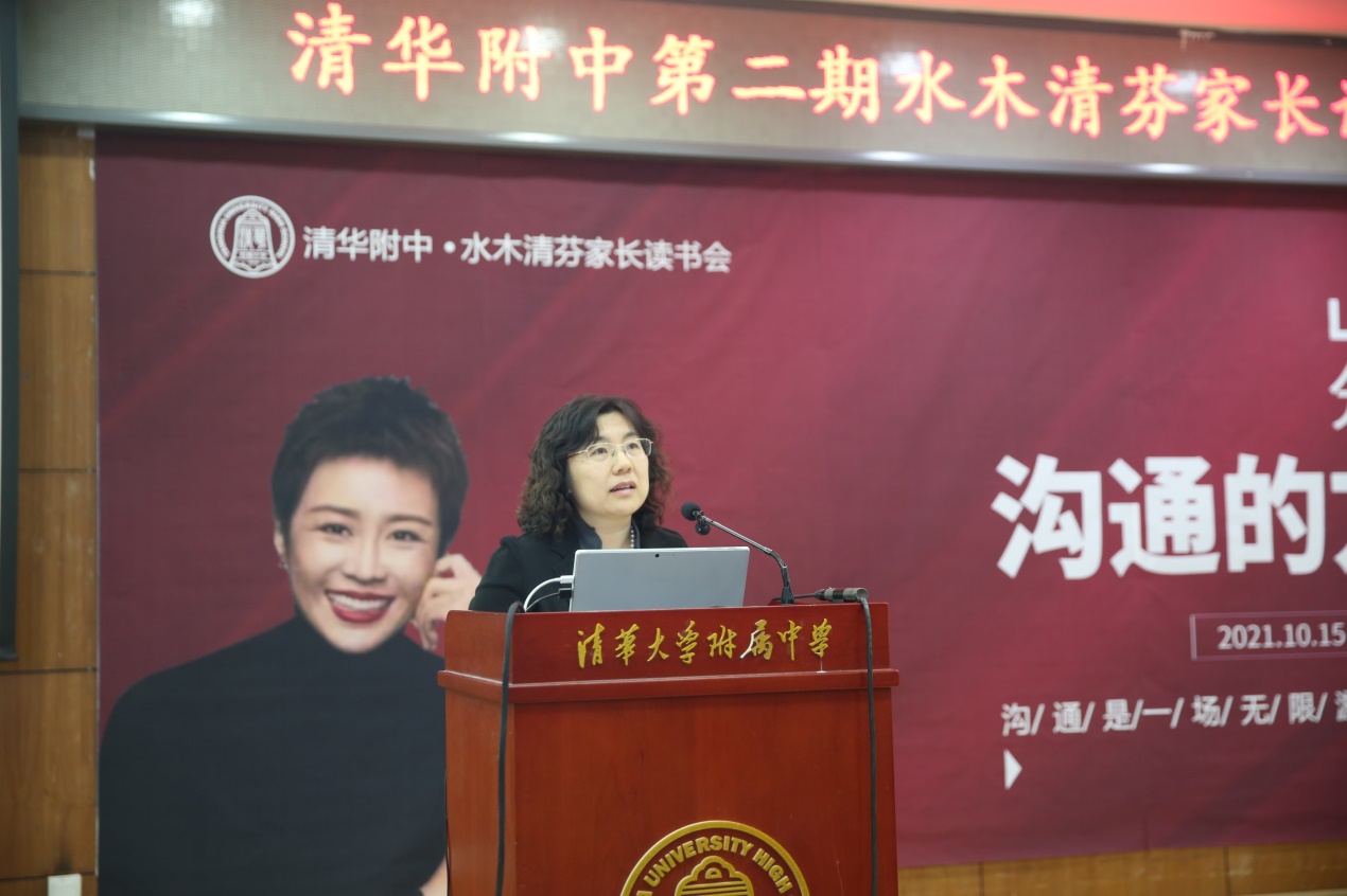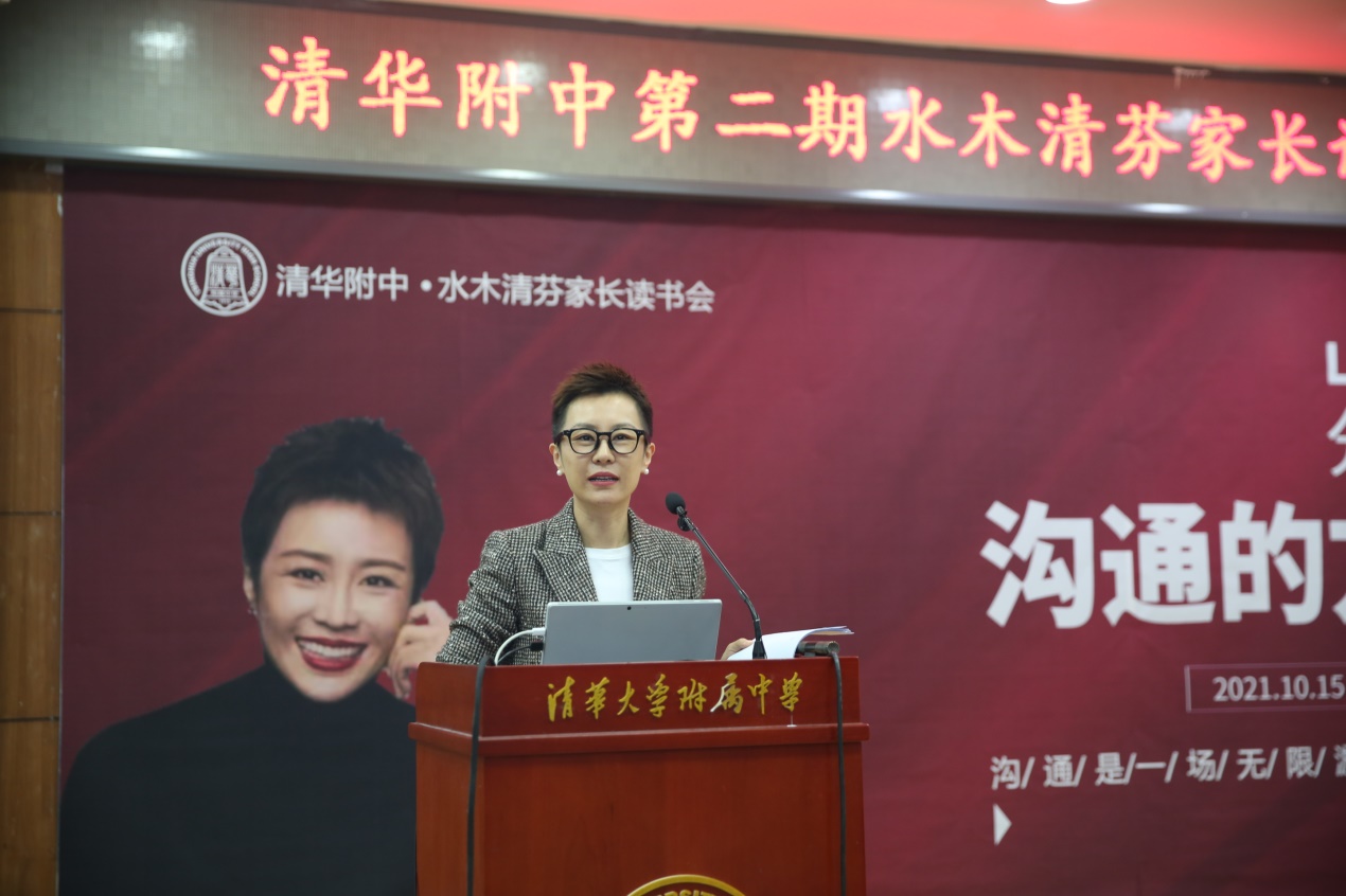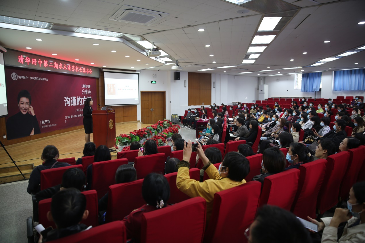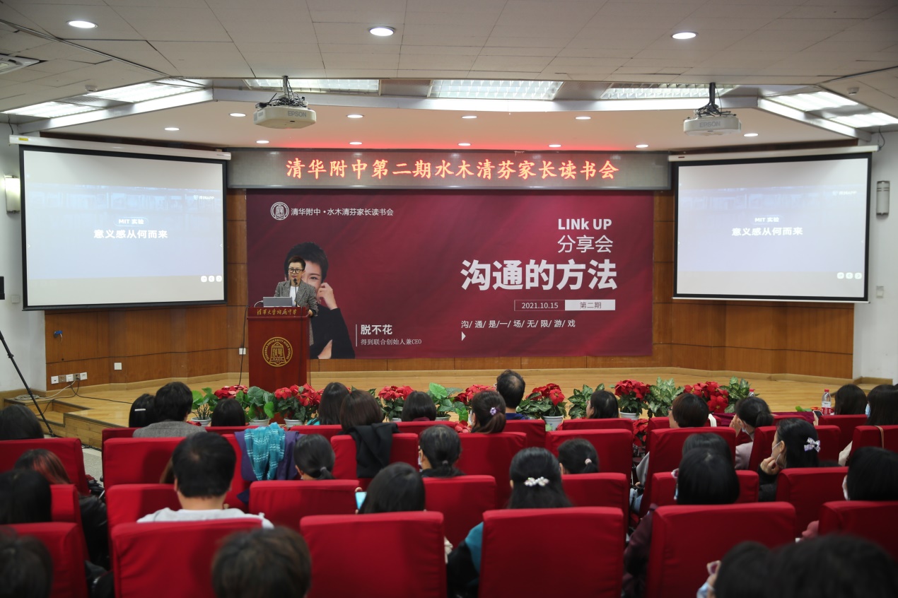 2021年10月15日,皇冠体育校家委会"水木清芬家长读书会"第二期在华茂楼106会议室正式开讲。本期线下读书会特邀请《沟通的方法》作者——“得到”联合创始人兼CEO脱不花女士,进行分享交流。皇冠体育副校长白雪峰、学生发展中心主任李书霞、家委会核心组织者、附中部分教师以及附中学生家长共300余人参与此次分享会。家委会会长初20级李恩杨妈妈主持了这次活动。