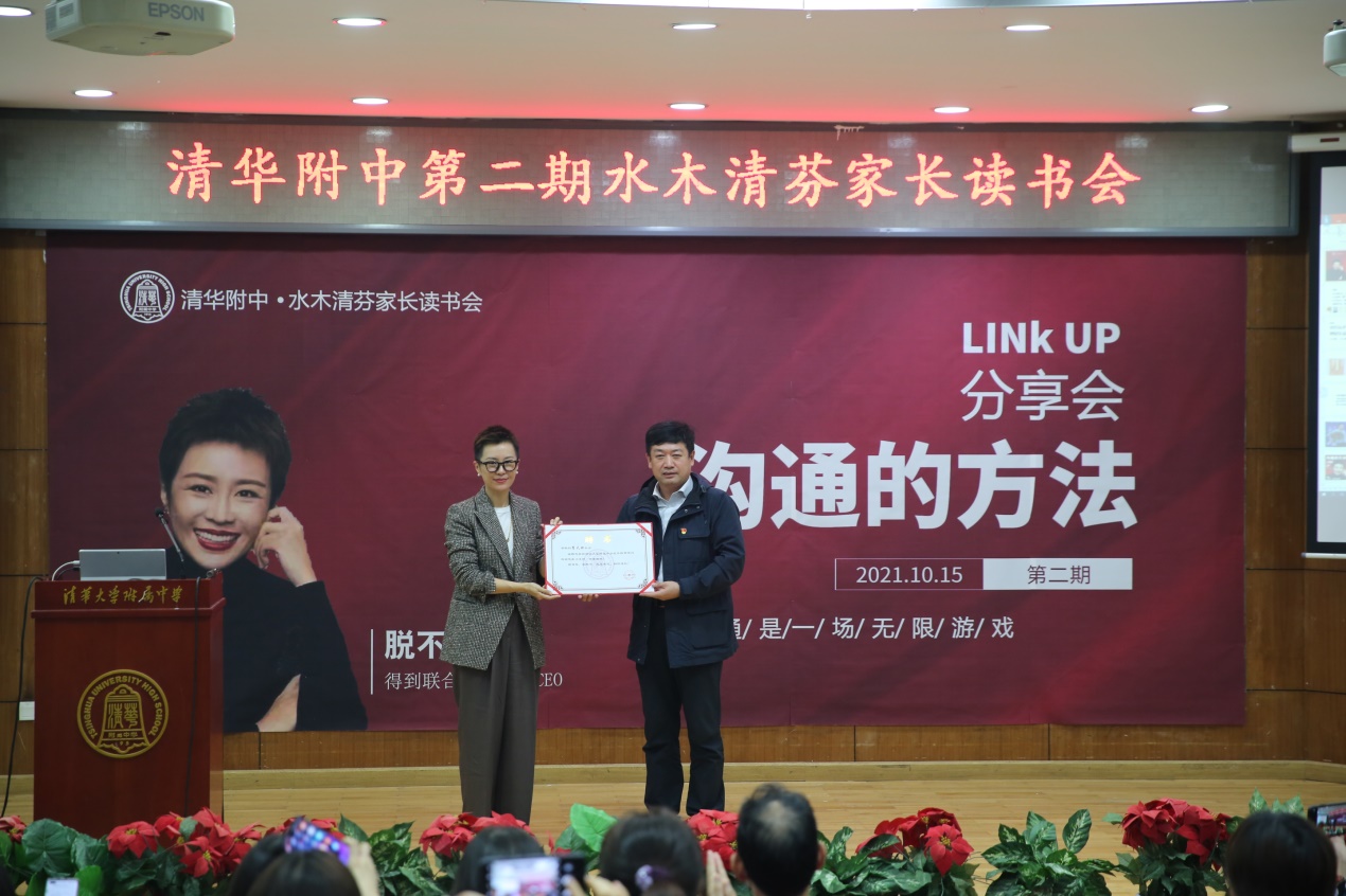 在大家热烈的掌声下,白雪峰副校长为脱不花女士颁发了校外教育顾问证书,并谈了自己的感受和对家长、老师们的期待:沟通是方法,也是目的;要想拥有好的沟通,需要做到四个方面——渴望沟通、懂得尊重、学习沟通的方法并加以运用和训练、心怀真诚。白校长邀请附中家长们积极加入校家委会“终身学习部”,与孩子共同学习、共同成长。