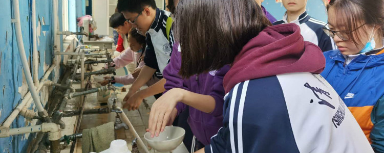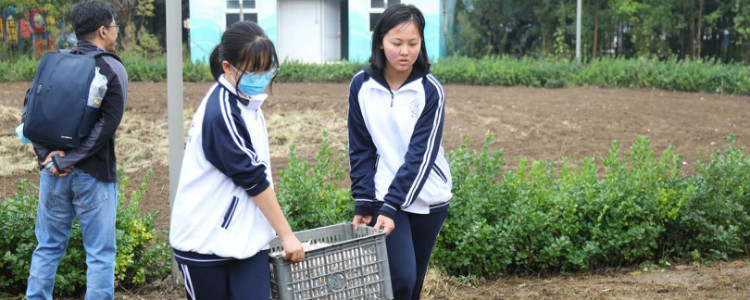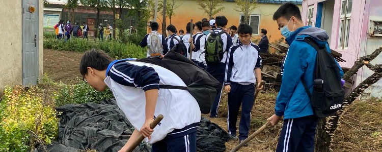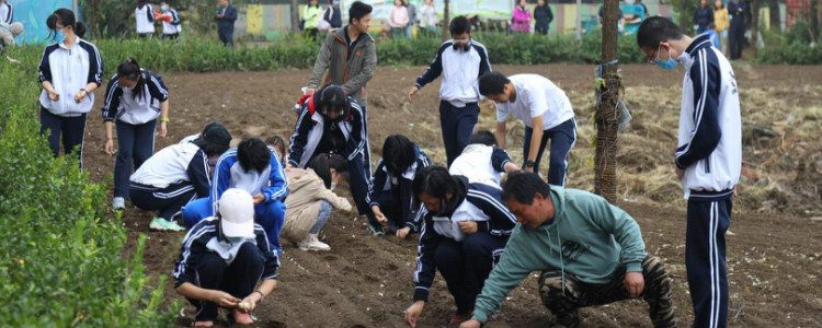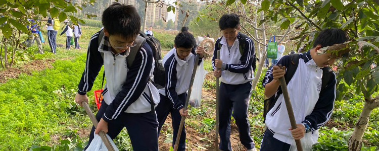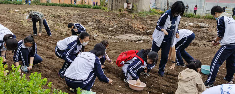 第三个环节,学习种蒜并清理菜地周围垃圾。同学们分为6个小组,其中2个小组准备种蒜,4个小组负责清理菜园周围小路上的枯草树枝。各个小组的组长率先学会了如何种蒜,随后教授组员种蒜的方法。在一次次弯腰埋蒜、起身向前的过程中,同学们手法愈加熟练,蒜与蒜的间隔越来越有规律,埋蒜的深浅程度也趋于一致。