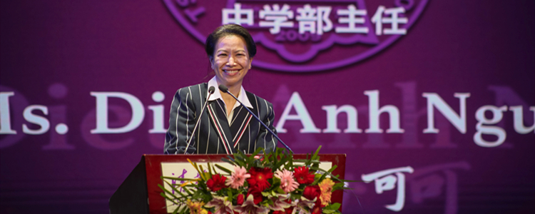 中学部主任Dieu-Anh Nguyen的致辞依旧幽默且充满力量。她引用美国著名文学家拉尔夫·沃尔多·爱默生的名言“生命是一场旅程,而不是终点”开场,并回顾自己25年在世界各地丰富的教育职业生涯,从小学、中学的任课教师到教育厅项目执行官。她分享了“关于我的6件小事”表达自己是一个“斜杠人”。作为新任中学部主任,她期待和学生们一起开启新的旅程。