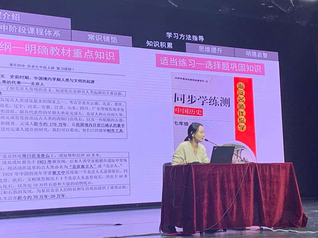 历史备课组长李琳介绍了历史课程和学习方法。她首先梳理了初中阶段的历史教材和课程体系,并提出学好历史需要较好的常识铺垫,或者可以反复熟读教材来提升知识积累,从而进一步提升思维、明德启智。