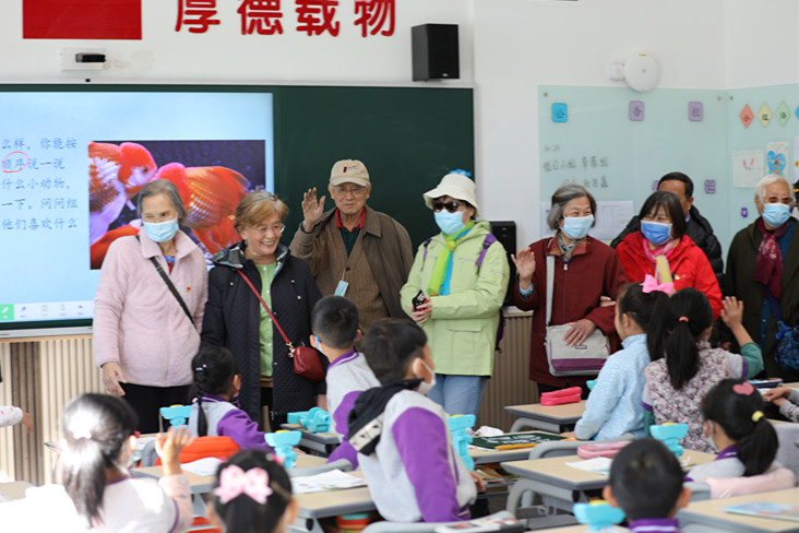 潭柘寺学校执行校长董蓓率领部分教师热情欢迎老教师们并详细介绍了学校的基本情况。潭柘寺学校是由皇冠体育官网于2020年6月在门头沟区协助筹办,学校位于门头沟区潭柘寺镇,包括幼儿园、小学部和中学部。2021秋季学期,学校小学部及附属幼儿园正式投入使用。离退休老师们分别参观了幼儿园以及小学部的教学楼、特色教室、实验室、操场等。参观过程中,老师们与幼儿园小班以及一年级部分同学简短互动。孩子们的活泼可爱、师资队伍的朝气蓬勃、校园环境的优美怡人给老师们留下了深刻印象。离退休老师们也就学校对当地的带动作用、对附中文化的传承提出积极的建议。