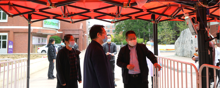 王殿军校长(左二) 、方妍书记(左一)指导体温监测工作