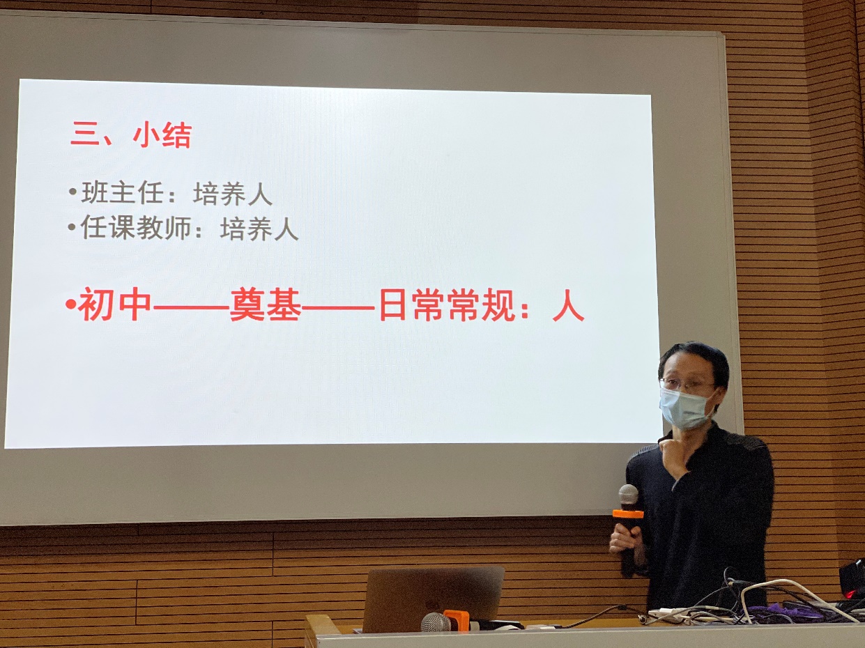 随后,张伟老师围绕班级常规管理,从课堂规范、日常和总目标这三个方面给青年教师提出了几点建议。他明确了中学阶段学生养成良好课堂习惯的重要性,从教师进班时间、教师授课站位、上下课起立常规、师生距离感以及重视年级通知等方面进行了交流分享。围绕“立德树人”的根本任务,他指出中学阶段班主任和任课教师的教育重点是培养人,并详细解读了现阶段应该培养什么样的人以及怎样培养人。