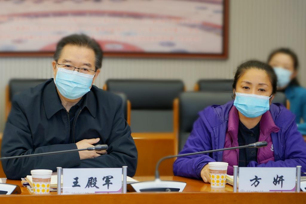 王殿军校长(左一)汇报工作,方妍书记(右一)参与调研