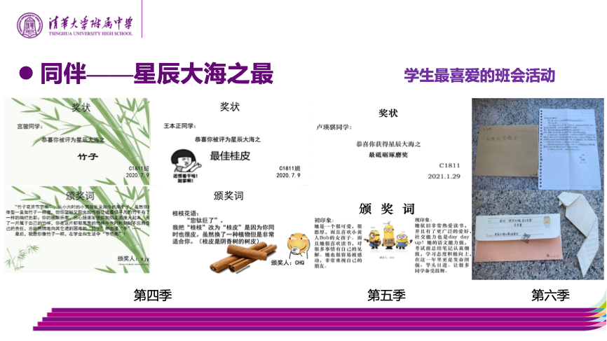 毕嘉宇老师以“班会那些事儿”为主题,分享开展班会的经验。毕老师虽然第一轮担任班主任,但是善于抓住班会这一班主任工作的主阵地,来开展学生发展工作。为了提升学生的意志品质,毕老师选择以“21天挑战”为主题开展班级活动,通过学生自主确定项目、记录过程、分享总结,来培养坚持与耐力。为了培养学生的“感恩”意识,毕老师设计了“为同学设计颁奖辞”、“女神节的祝福”、“跨时代的留言”、“父与子漫画展”、“寻秋季、共华诞”等丰富多彩的班级活动,利用新颖有趣的形式,教会学生对同伴、对家人、对母校的感恩之心。
