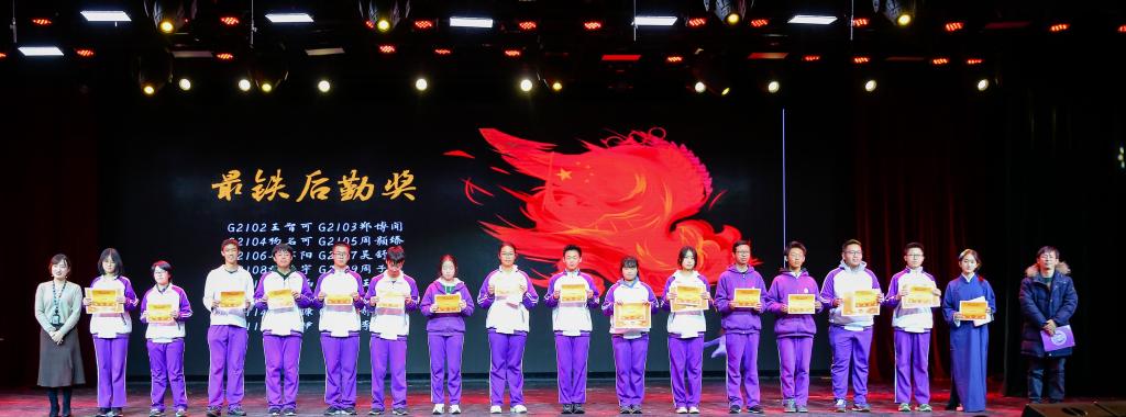 高21级年级组长李劲松老师(右一)、副组长唐洁老师(左一)为各班“最铁后勤”颁奖