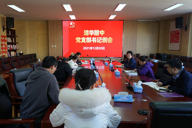 党委副书记张洁首先带领支部书记学习《清华大学教职工党支部工作规定》,重点强调党支部的职责与任务,特别是要强化支部的政治功能。她带领支部书记们一起学习了《皇冠体育党支部在人才引进、教职工聘用、年度考核、晋职晋级、评奖评优、人事调整等工作中把好政治关、师德关的工作办法》,全面掌握教职工政治把关和师德师风考核评价流程。会议同时通报了附中2021年党建工作评分情况以及党费公开。全体在职党支部书记在2021年的工作总结回顾的基础上对新一年的工作思路和重点有了清晰的认识。