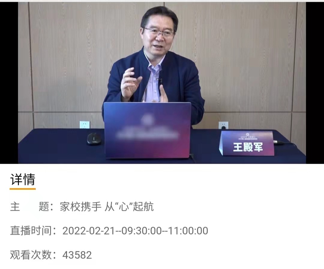 校长王殿军在线上为家长学校带来主题为“家校携手 从‘心’起航”的开学第一课,吸引了四万余人在线学习。