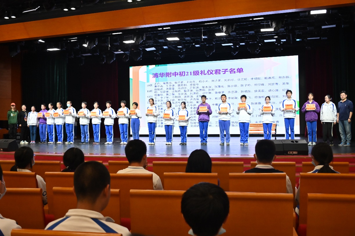 主持人首先介绍了初一年级“文明礼仪教育月”系列活动,之后宣读各班“文明君子”年级表彰,各班代表上台领奖,张彪、李冰清和李冰三位老师为各班“文明君子”颁奖。