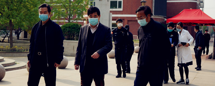 王殿军校长(左一)与解巨钊副校长(右一)陪同高斌书记(中)进行检查