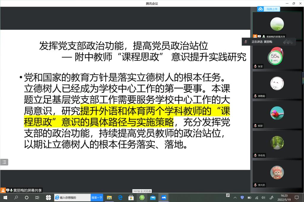2022年5月19日下午,外语与体育教研组联合党支部围绕“疫情之下支部党员如何团结一心,发挥先锋模范作用”开展线上主题学习和讨论。支部党员38人参加了本次主题学习组织生活。