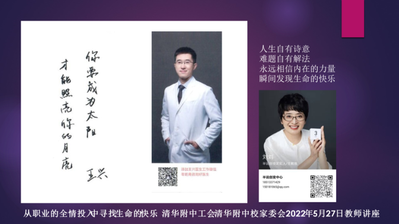 讲座结尾,刘教练和王医生分别为教职工们送上的话:“你要成为太阳,才能照亮你的月亮”、“人生自有诗意,难题自由解法,永远相信内在的力量,瞬间发现生命的快乐”。
