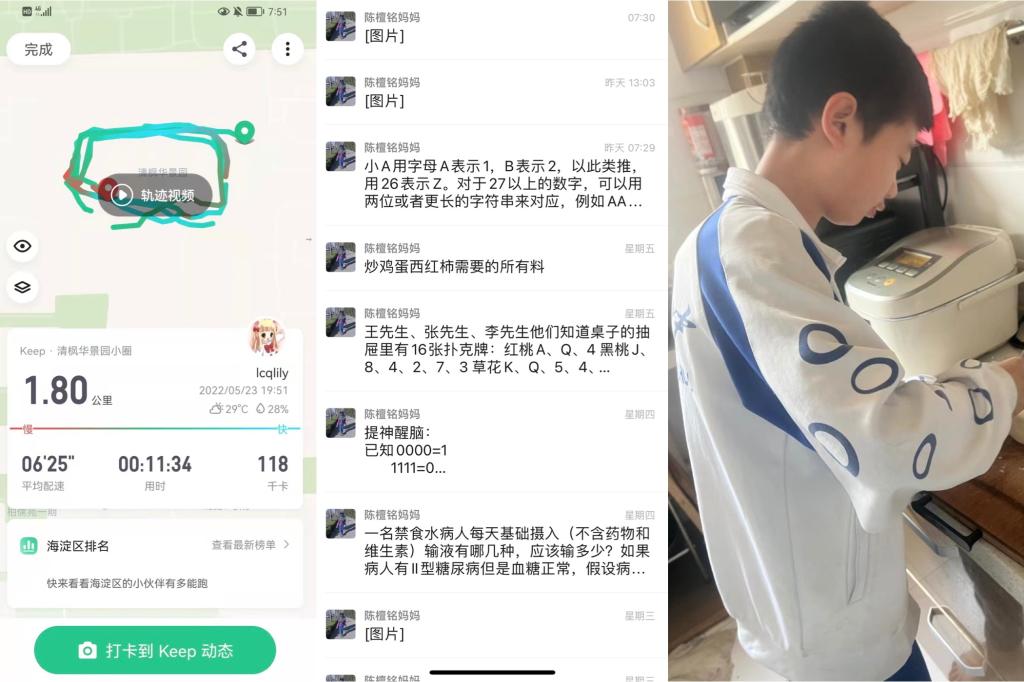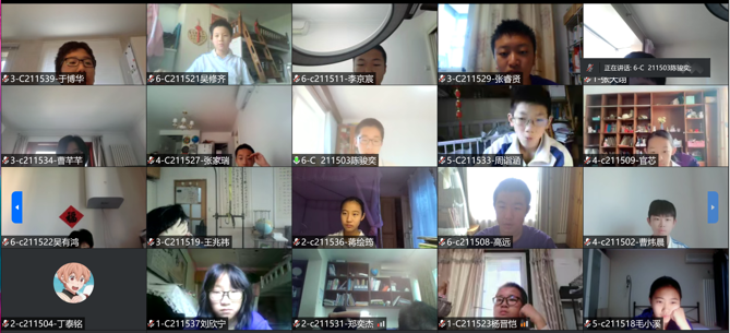 再次,幸福居家是居家学习的首要目标。初2104的同学们纷纷承担起力所能及的家务,并开展了手机管理班会;初2113班组织了“走进清华四君子”特色班会,从劳动、自习、读书、锻炼等方面,鼓励同学们争当“居家君子”;初2117班同学每天早、午课前进行“提神醒脑小练习”,同学们自行出题,其他同学在小组群中积极回答,形成线上学习氛围;初2118班开展“十八班者”班级特色活动,同学们施展“十八般武艺”进行自主锻炼、学习与沟通。