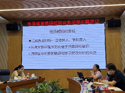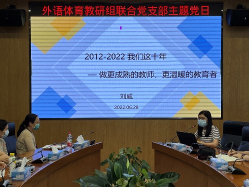 2022年6月28日下午,外语体育教研组联合党支部以“实现伟大复兴,从我做起,从现在做起”为主题,开展主题党日。支部党员37人、积极分子及群众8人参加了本次主题党日。