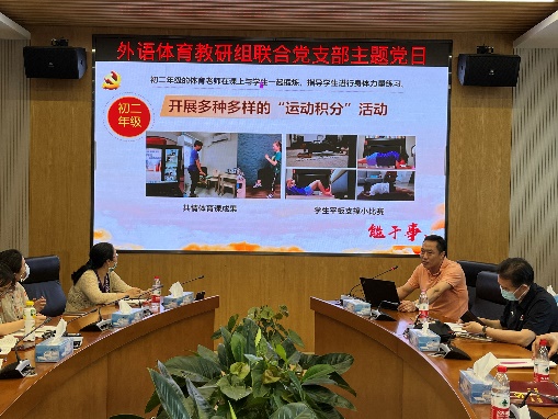 第三部分的关键词是“百年变局和世纪疫情相互叠加下的青年使命”。体育教研组组长丁磊以“想于事、能于事、干成事——牢记使命 教学相长”为题,对疫情下体育组六个年级如何进行课程创新进行了介绍。体育组创造性地将师生竞赛、家庭积分等活动纳入到课程之中,以提高学生参加体育锻炼的积极性。