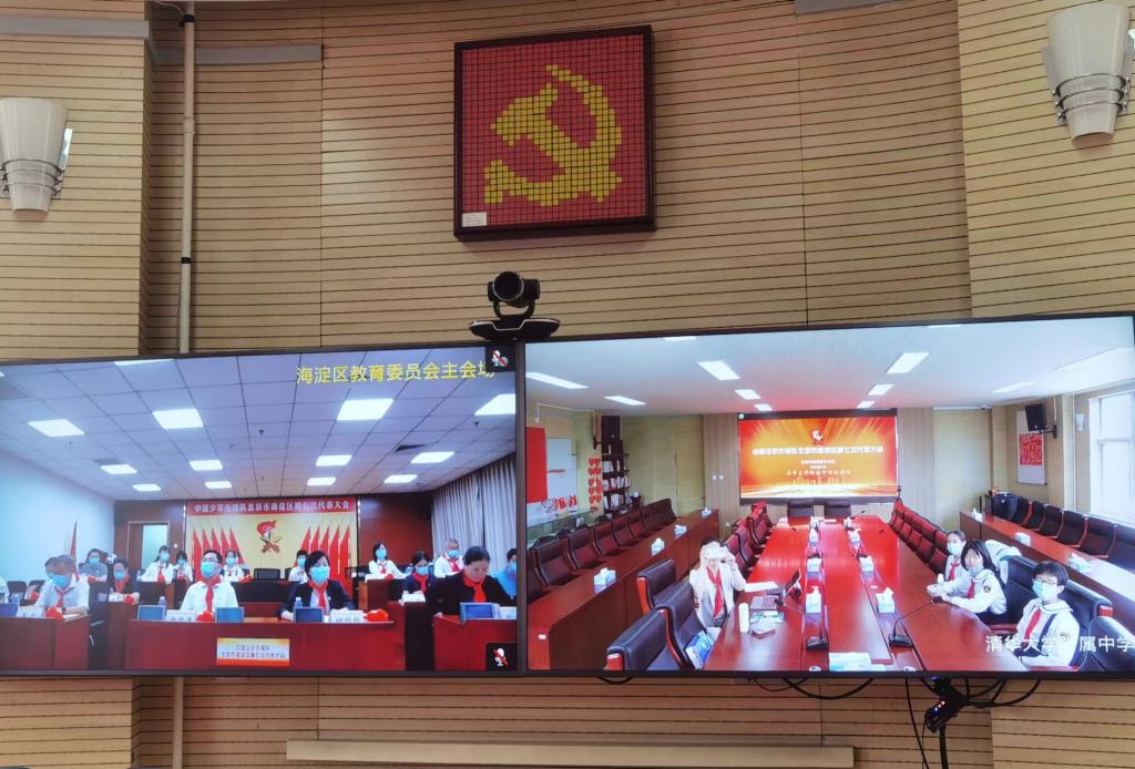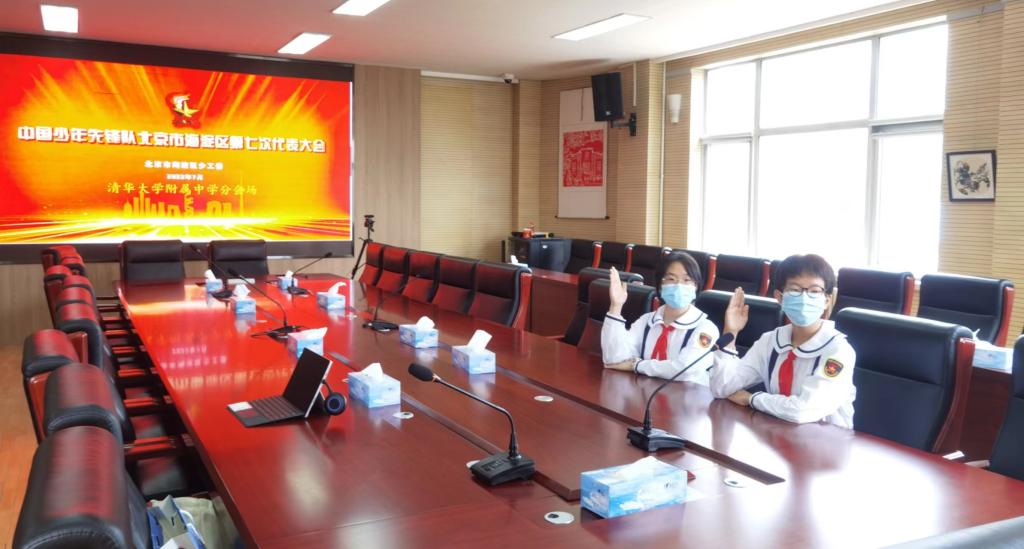 今天召开了中国少年先锋队北京市海淀区第七次代表大会。此次会议采用了线上的形式进行。多个学校的代表端坐在会议桌前,我有幸作为代表之一,换好了服装,期待着会议的开始。