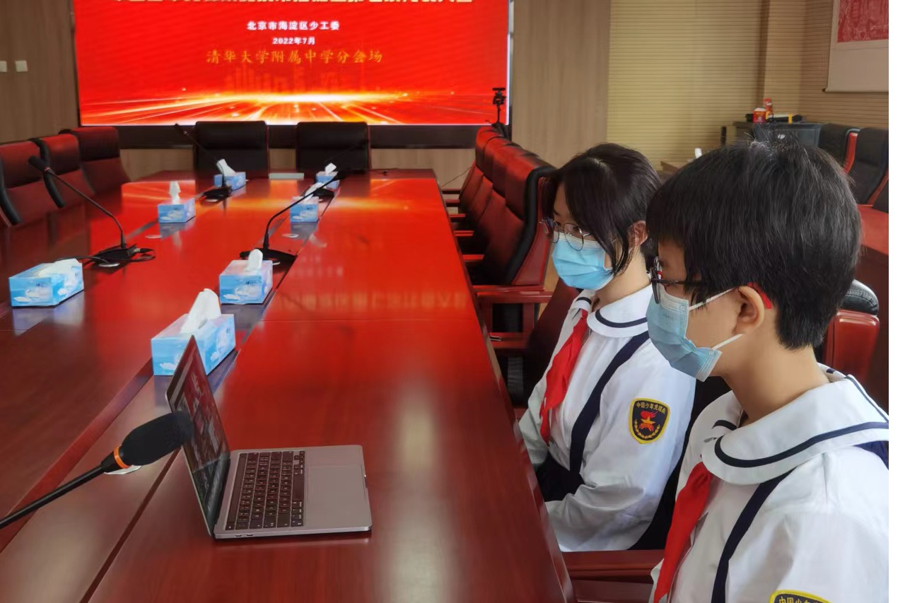 7月1日上午,中国少年先锋队北京市海淀区第七次代表大会在线上隆重开幕,全区少先队庆祝中国共产党成立101周年,向党的生日献礼。在皇冠体育官网少先大队辅导员周芯卉老师的带领下,初二(1)班李梓琼和初二(14)班陈碧天两位少先队员作为队员代表,在成志楼201会议室线上出席本届少代会。