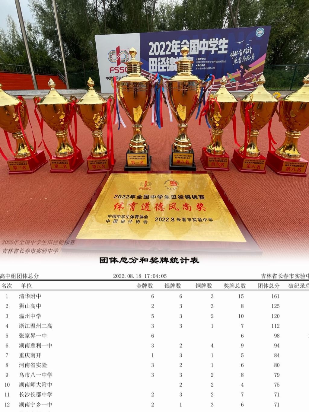 本次2022年全国中学生田径锦标赛团体总分和奖牌统计表
