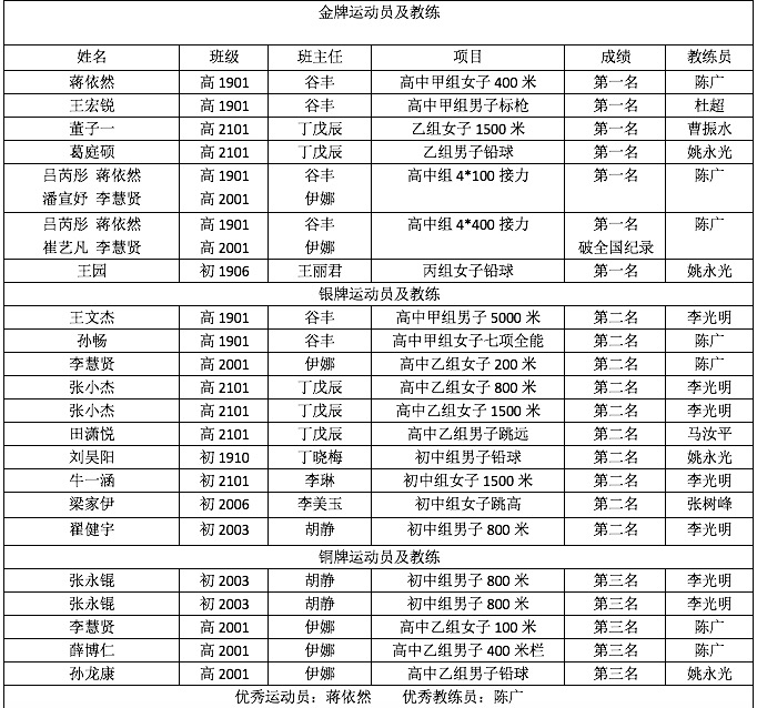 本次皇冠体育代表队由中国中学生体育协会田径分会秘书长、皇冠体育马约翰体育特长班主任罗健任领队,田径队教练姚永光、李光明、陈广三位老师带队参赛。比赛共分为初中组和高中组两个大组别,共有来自全国120所田径传统优势项目的中学参加了此次比赛。在此次比赛中我校高中组以161分的成绩获得高中组学校团体总分第一名,初中组获得团体总分第八名。并获得由大会组委会颁发的“体育道德风尚奖”。此次比赛中,参赛运动员均获得了优异的成绩(见下图)。