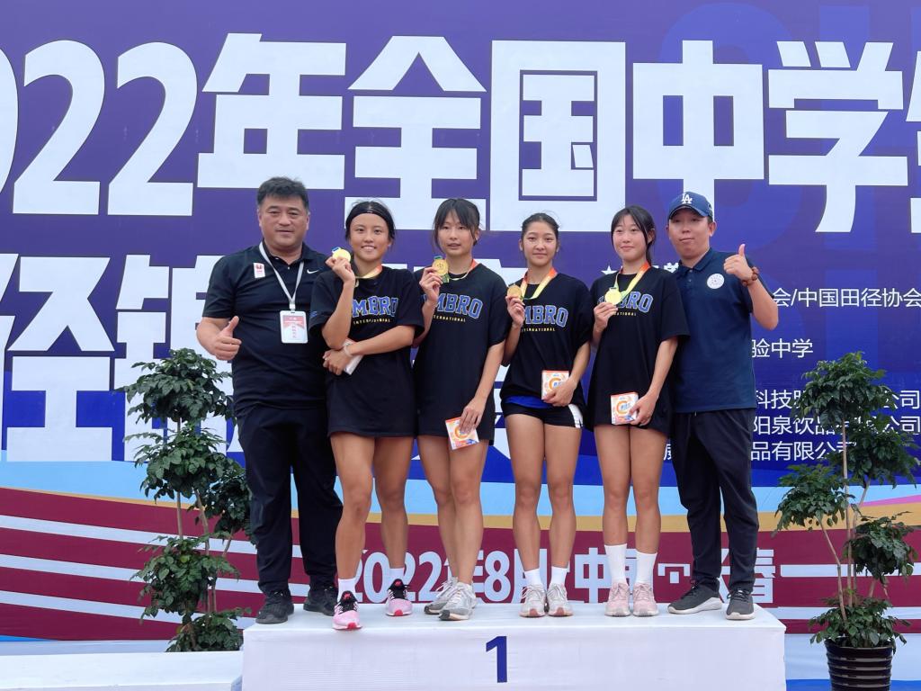 高中组女子4*400米冠军并打破了中田赛全国中学生纪录(左起:领队罗健、运动员:吕芮彤、崔艺凡、蒋依然、李慧贤、教练陈广)