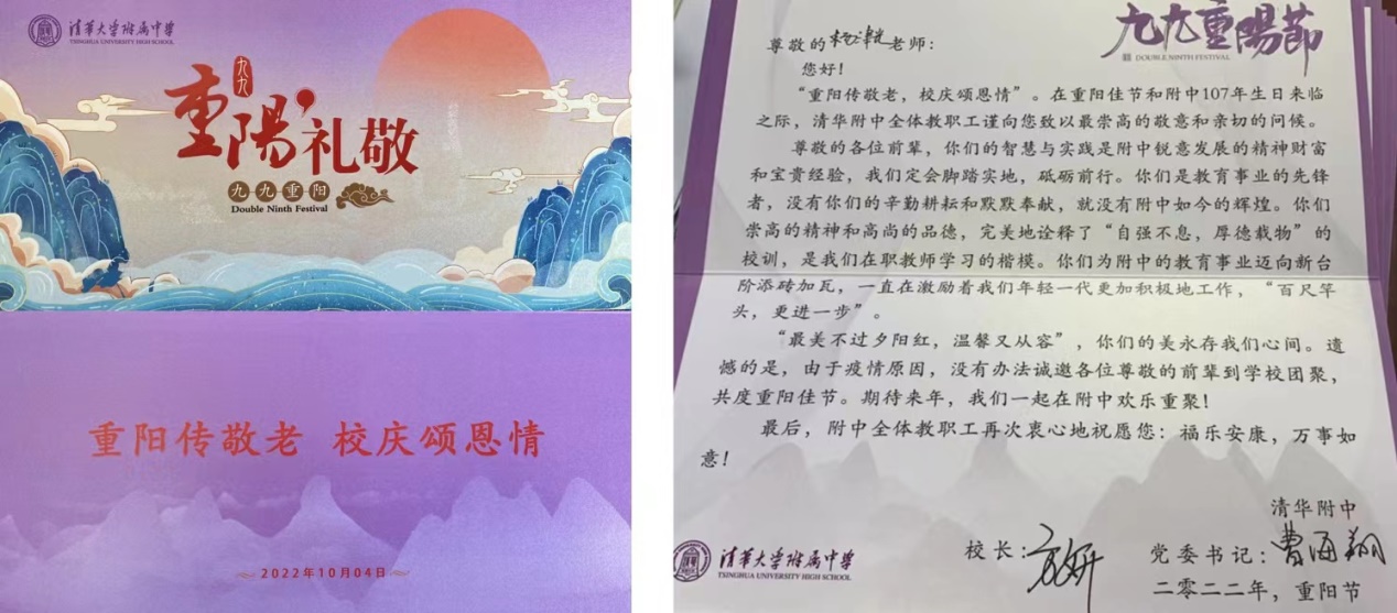 “重阳传敬老,校庆颂恩情”。在重阳佳节和附中107周年校庆即将来临之际,校长方妍、党委书记曹海翔、党委副书记兼工会主席张洁带领工会干部、离退休领导小组开展2022年离退休教职工的重阳节慰问活动,并代表全体教职工向离退休的老同志致以最崇高的敬意和亲切的节日问候。